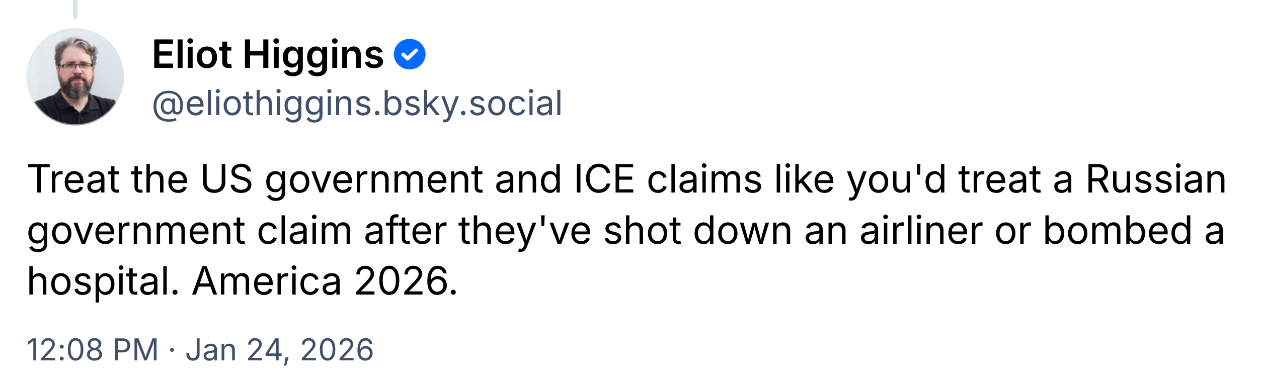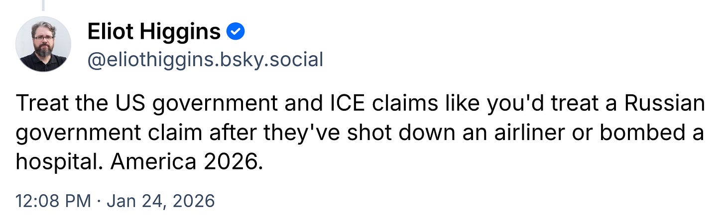 “Treat the US government and ICE claims like you’d treat a Russian government claim after they’ve shot down an airliner or bombed a hospital. America 2026,” Higgins wrote.
