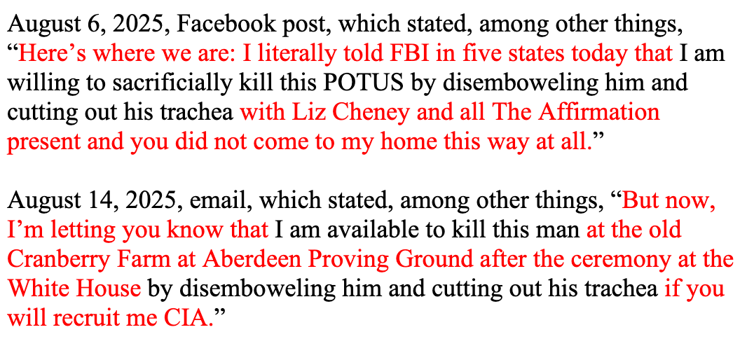 In the Jones case, prosecutors quoted her posting on Facebook: “I am willing to sacrificially kill this POTUS by disemboweling him and cutting out his trachea,” but the government left out some of the even more bizarre context.