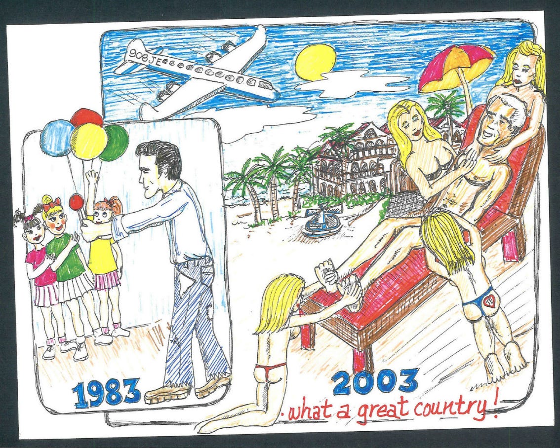 On the left side panel marked with the year “1983,” there is a drawing of what appears to be a younger, brown-haired Epstein handing three young girls balloons and a lollipop. On the right side, marked two decades later with the year “2003,” a now-gray haired Epstein is getting massaged by four young blonde women, one of whom appears to have her hand on his groin. The caption celebrates Epstein’s transformation with the message: “what a great country!”