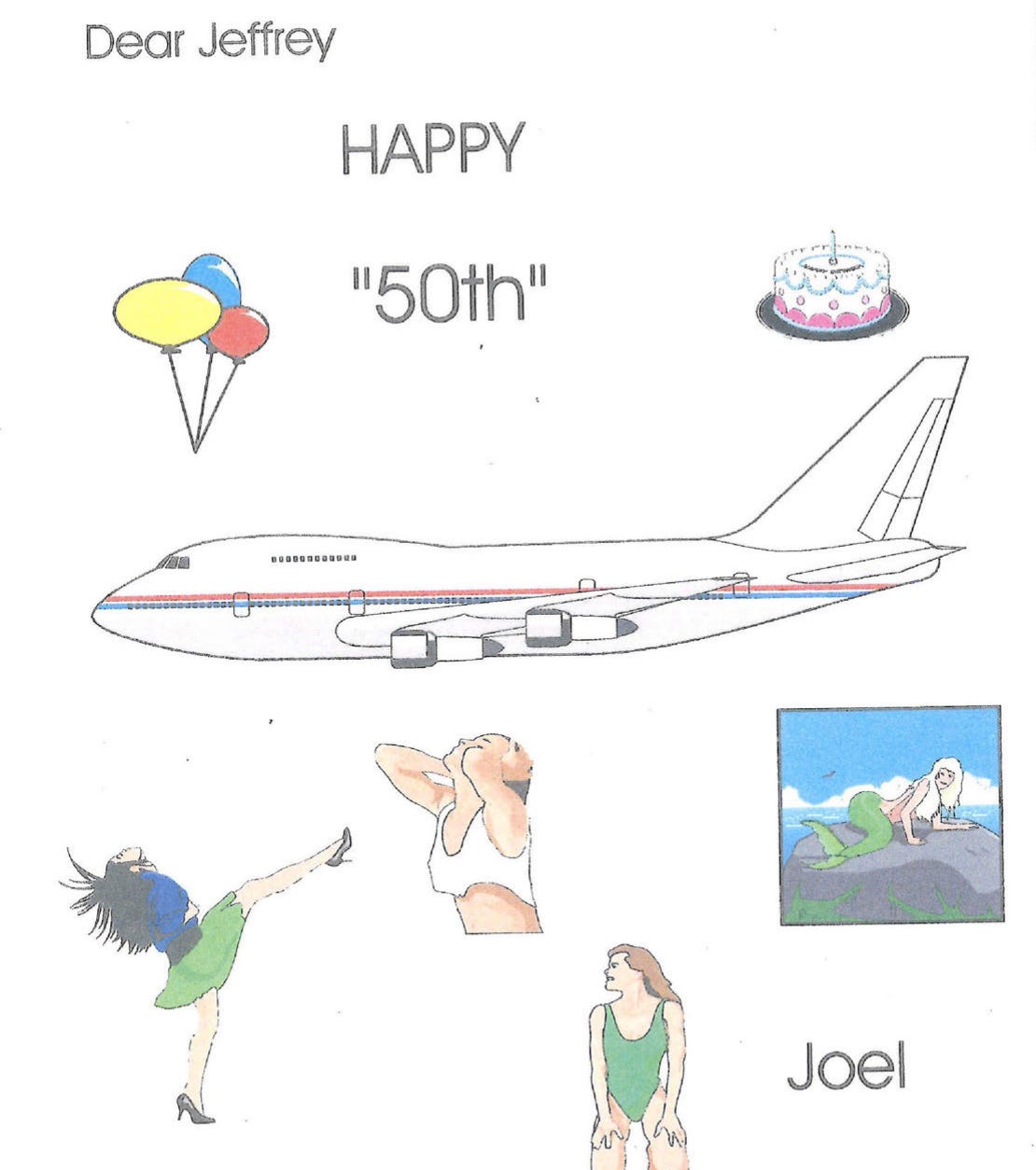 The House Oversight Committee’s release of the full, 238-page birthday book shows that Pashcow’s entry appears to start two pages before that photograph with the words: “Dear Jeffrey, HAPPY ‘50th’” and “Joel,” surrounded by computer generated images of balloons, a birthday cake, and young women in bathing suits and a short skirt.