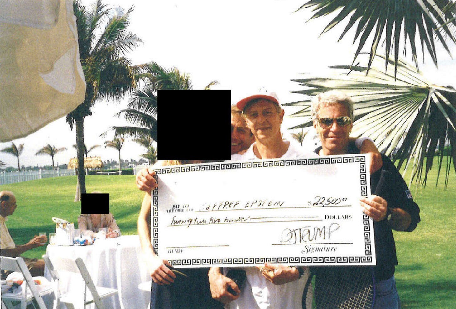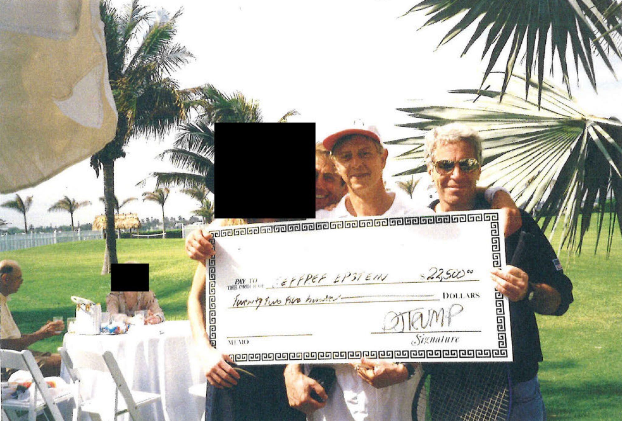 “The Pashcow letter included a photo of a posterboard-sized check for $22,500, which had been mocked up to appear that it was sent from Trump to Epstein. Beneath it, a handwritten caption said: ‘Jeffrey showing early talents with money + women sells ‘fully depreciated’ [redacted] to Donald Trump for $22,500.’ The woman’s name is redacted in the image.”