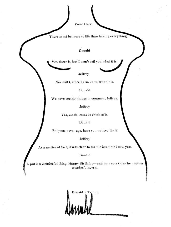 By now, it’s well-known that Jeffrey Epstein’s 50th birthday book has a copy of the letter that Donald Trump claimed did not exist, a drawing of a nude female figure with a signed “Donald” at her crotch.